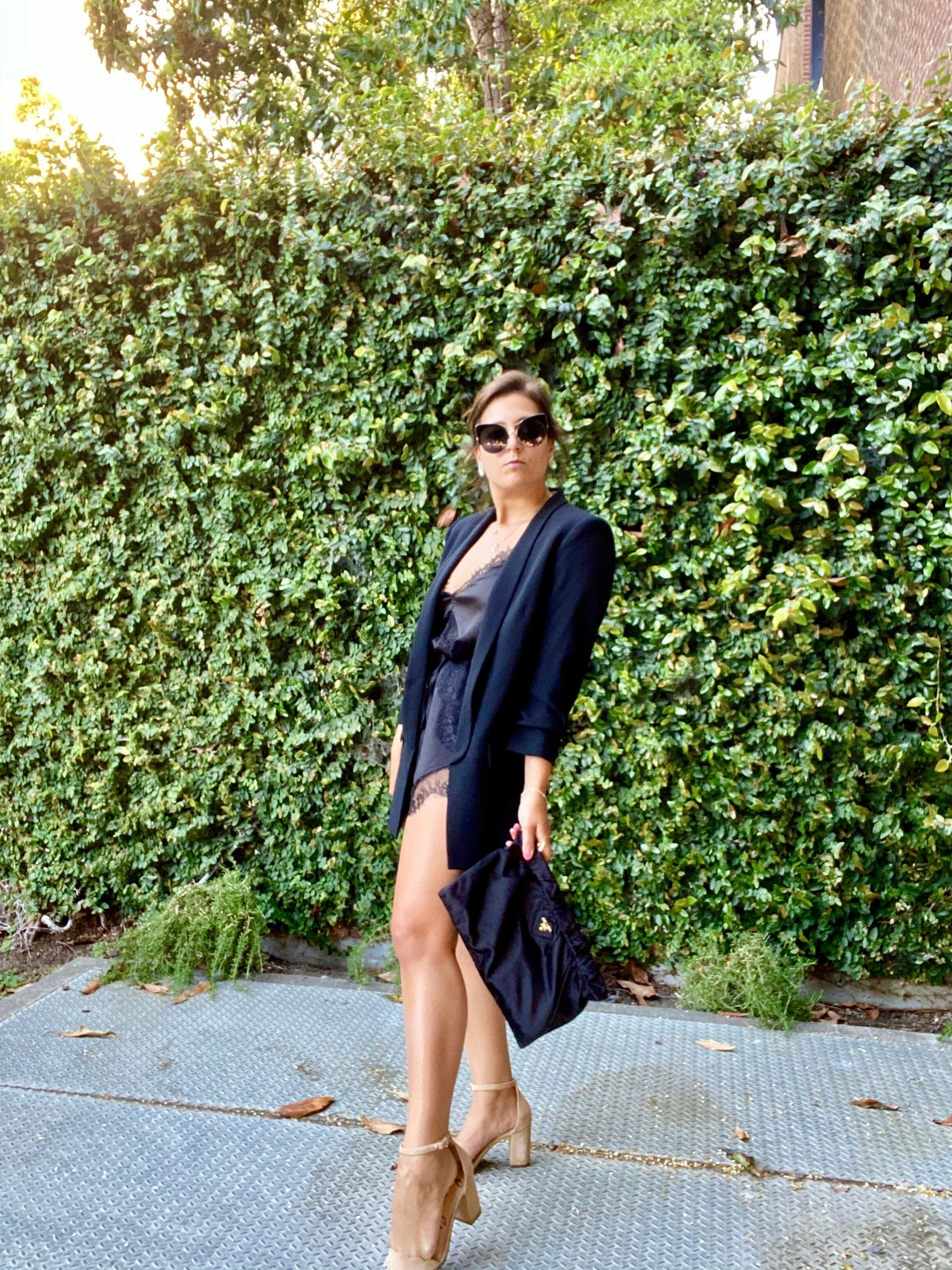 I am forever on the hunt for pieces that are as close as you can get to lingerie as possible. I love tiny, filmy, silky things—and bonus if there’s a peek of lace. I especially love to pair this type of look with an oversized blazer that 1) is longer than the rest of the outfit and 2) offers some structure to balance out the opposing flowiness of the other pieces.